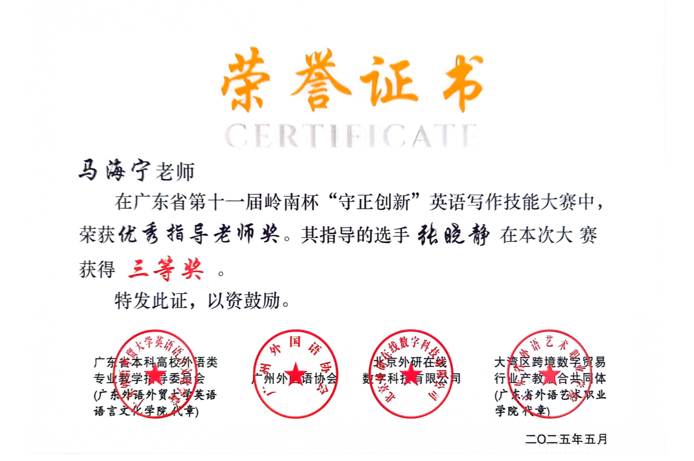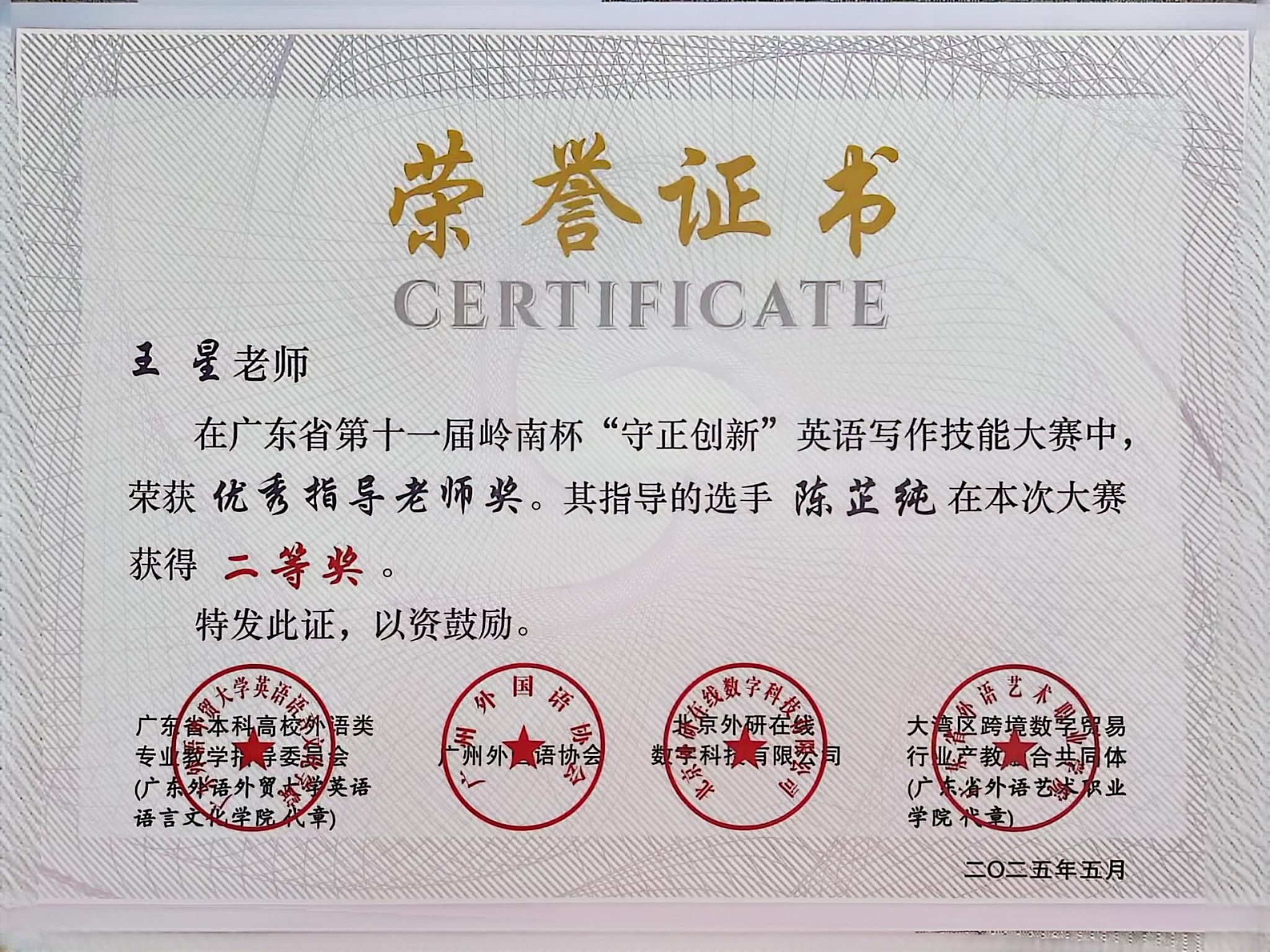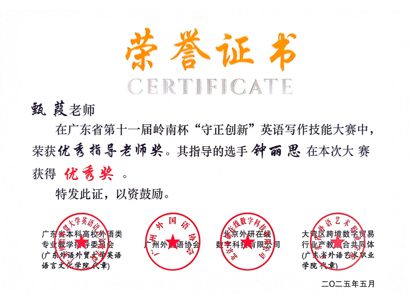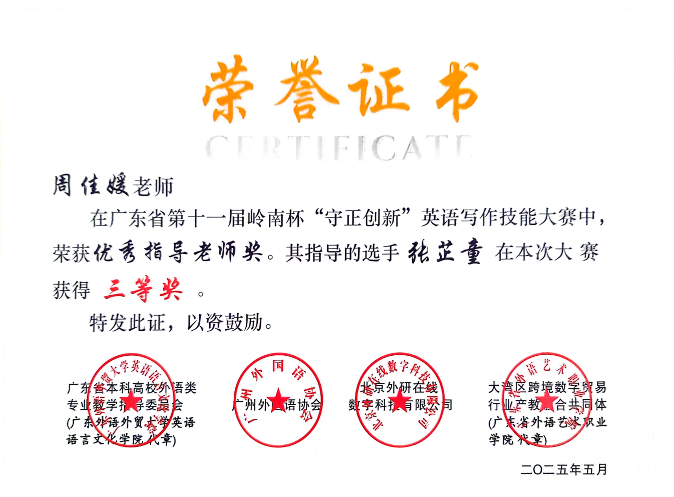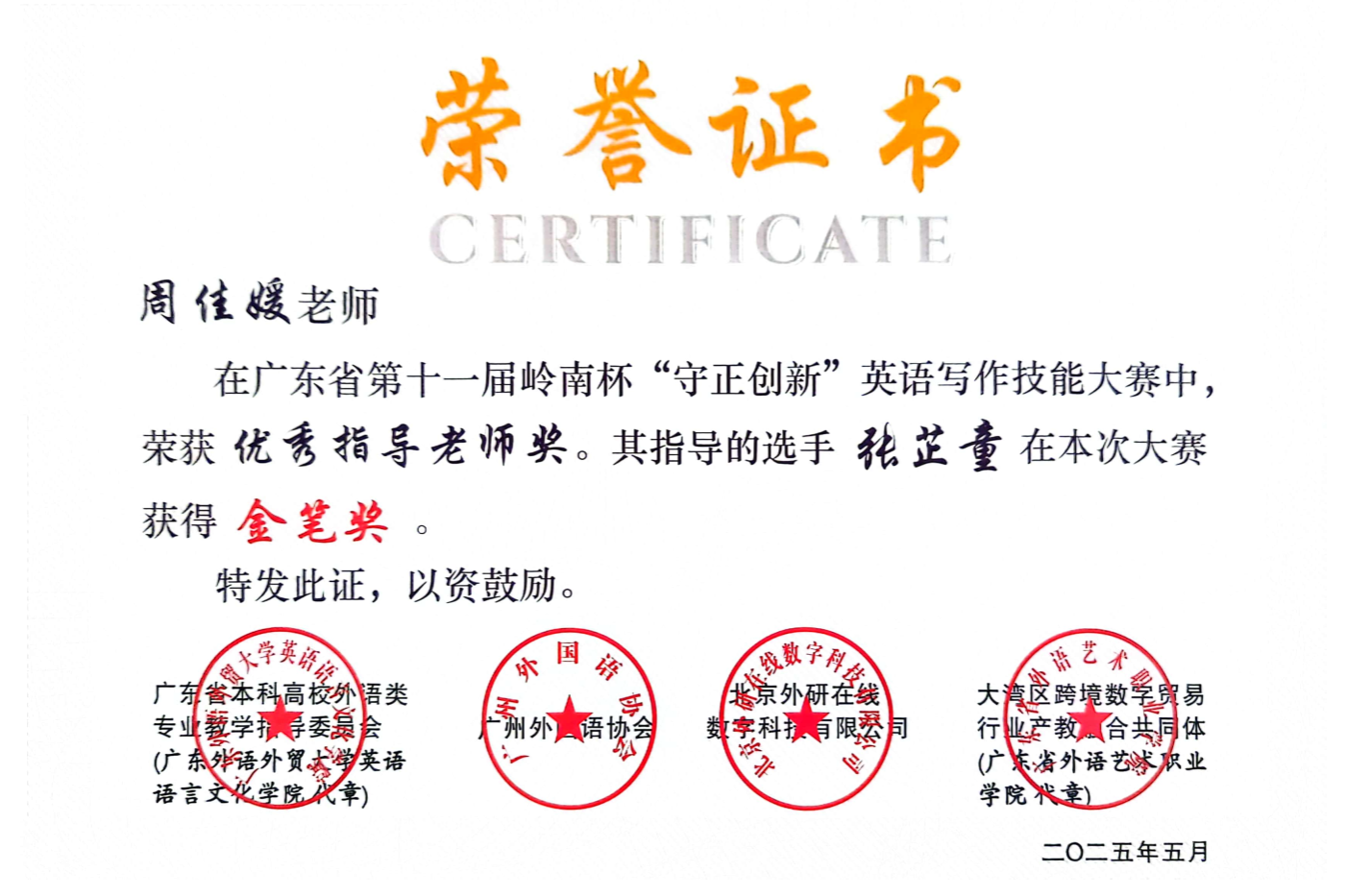 近期,英国上市公司365教师指导员工参与省级英语写作竞赛成绩斐然,捷报频传。在两项重要的省级赛事中,公司教师指导员工共获奖11项,其中周佳媛老师指导张芷童同学荣获2025年岭南杯英语写作技能大赛省级金笔奖;苗媛媛老师指导郭怡欣同学荣获2025年广东省第十二届“联盟杯”本科高校写作大赛省级非英语专业组特等奖。详细名单如下所示。