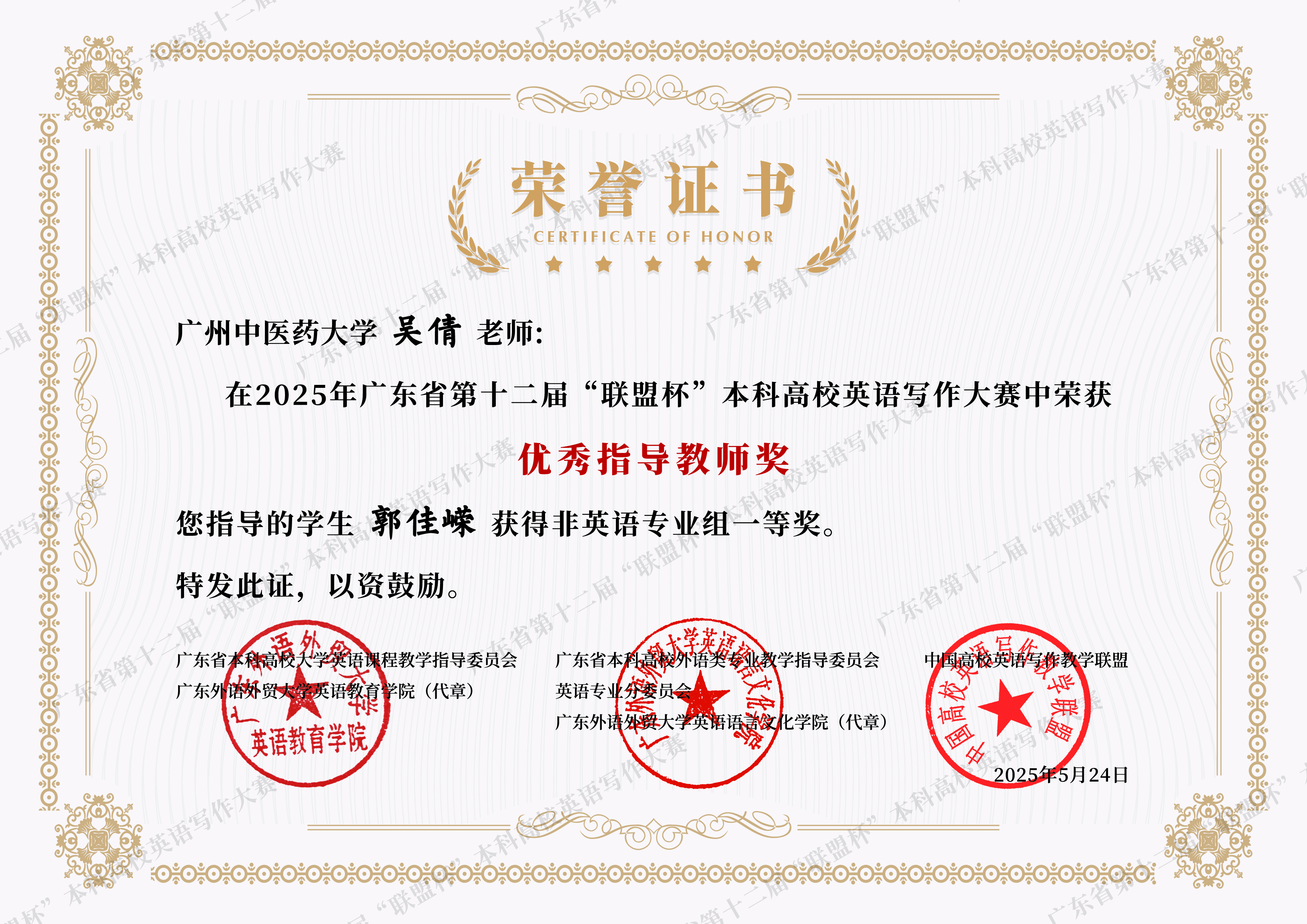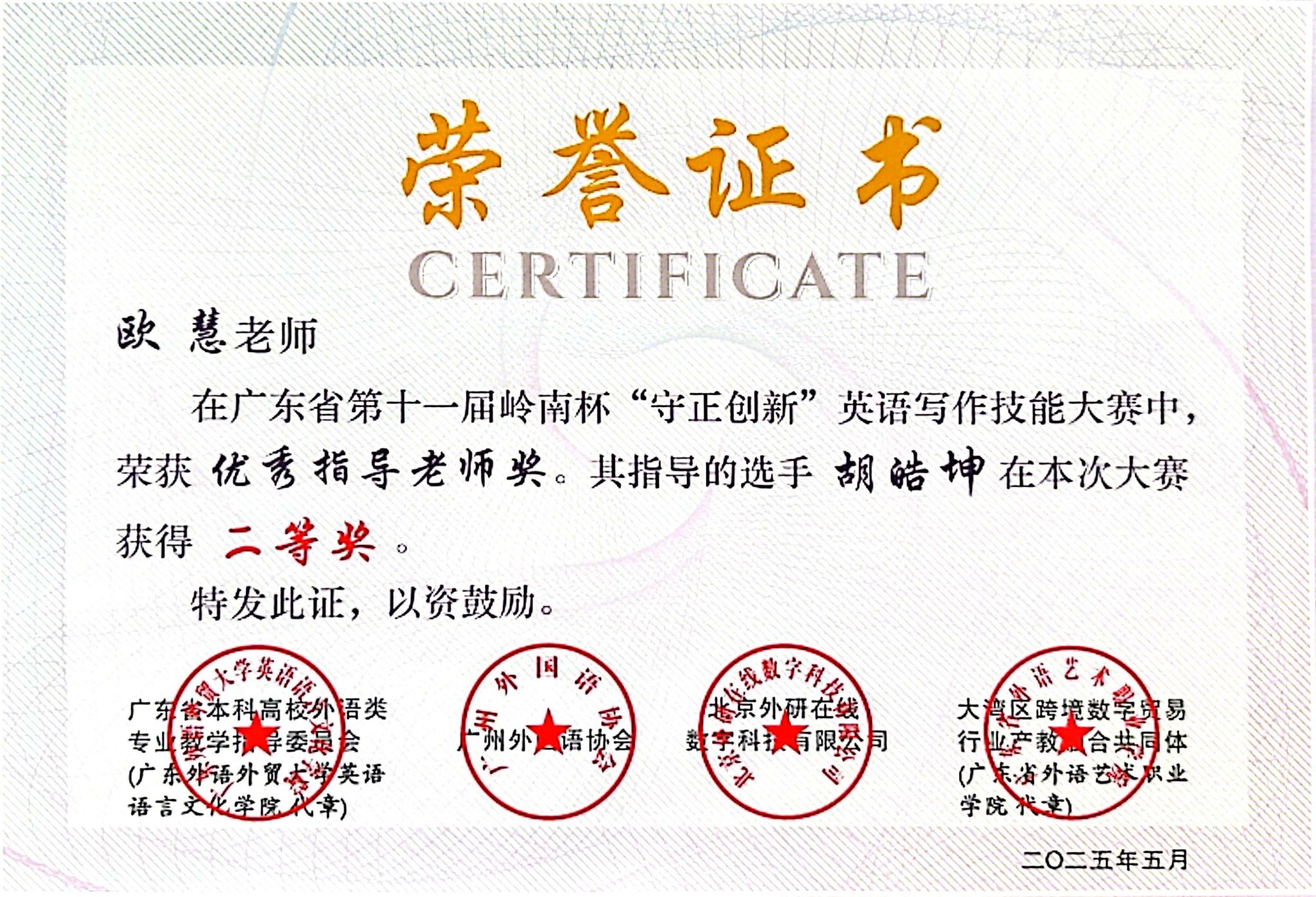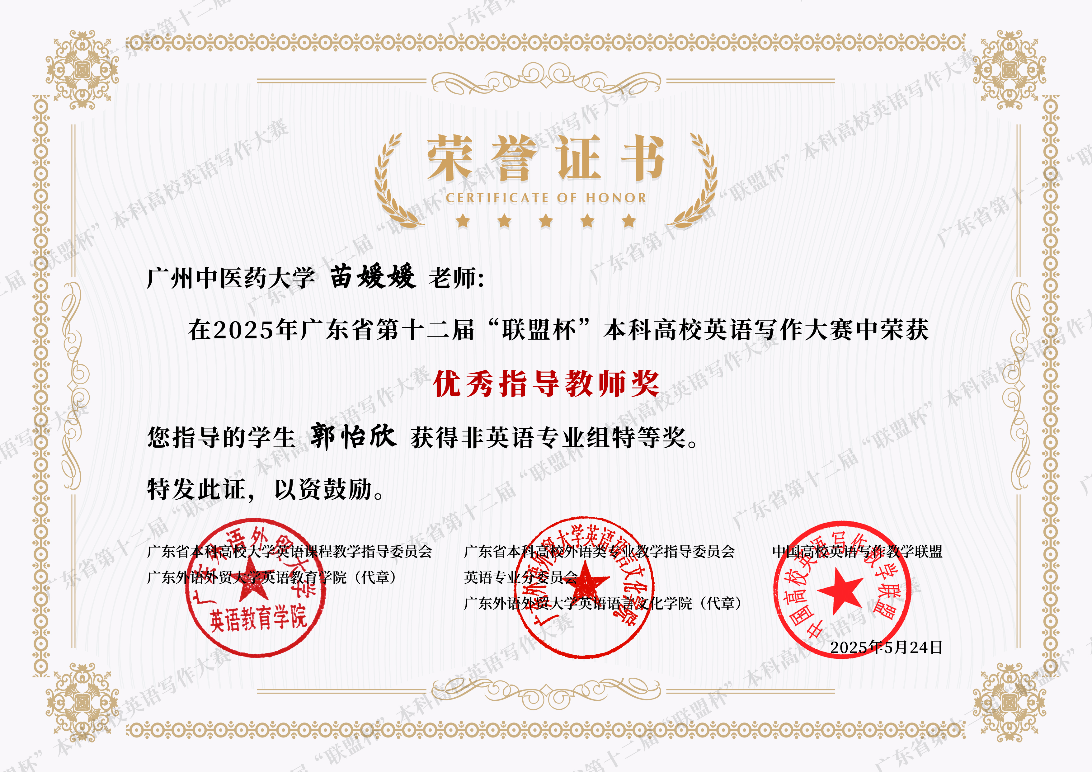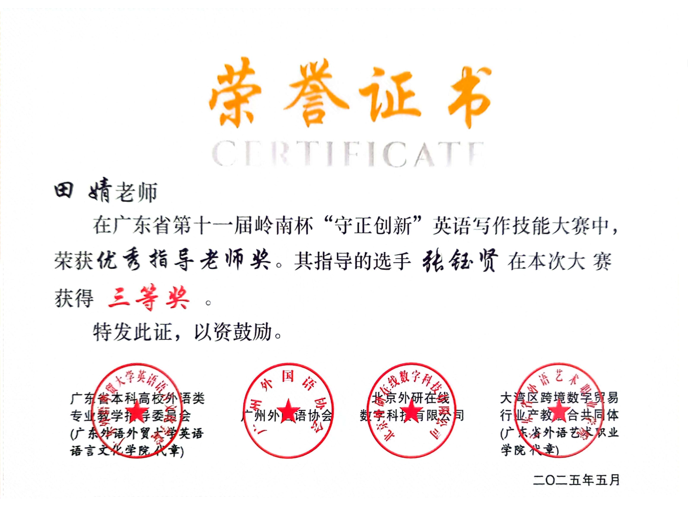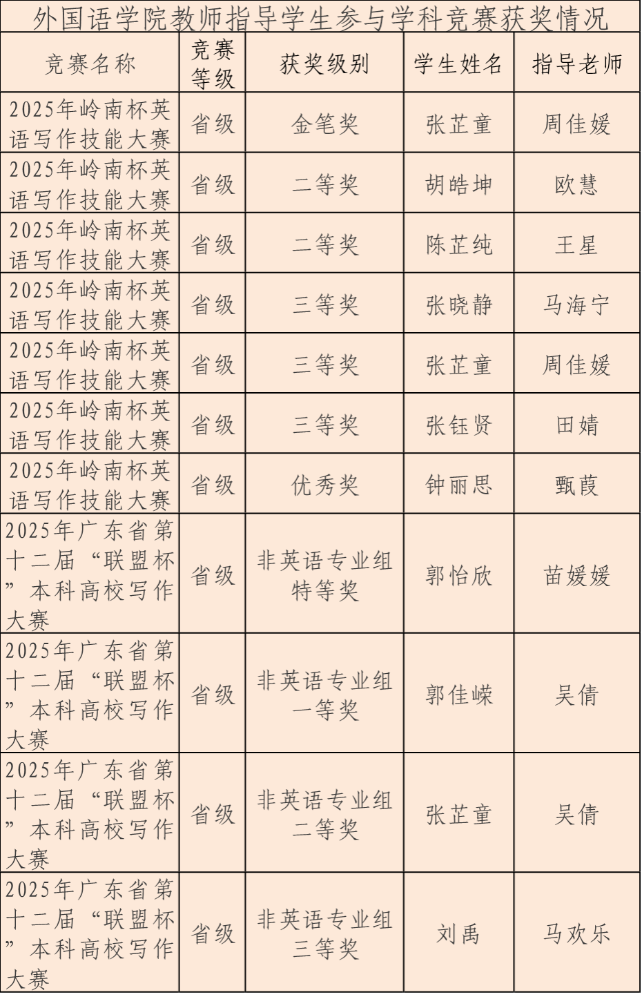 近期,英国上市公司365教师指导员工参与省级英语写作竞赛成绩斐然,捷报频传。在两项重要的省级赛事中,公司教师指导员工共获奖11项,其中周佳媛老师指导张芷童同学荣获2025年岭南杯英语写作技能大赛省级金笔奖;苗媛媛老师指导郭怡欣同学荣获2025年广东省第十二届“联盟杯”本科高校写作大赛省级非英语专业组特等奖。详细名单如下所示。