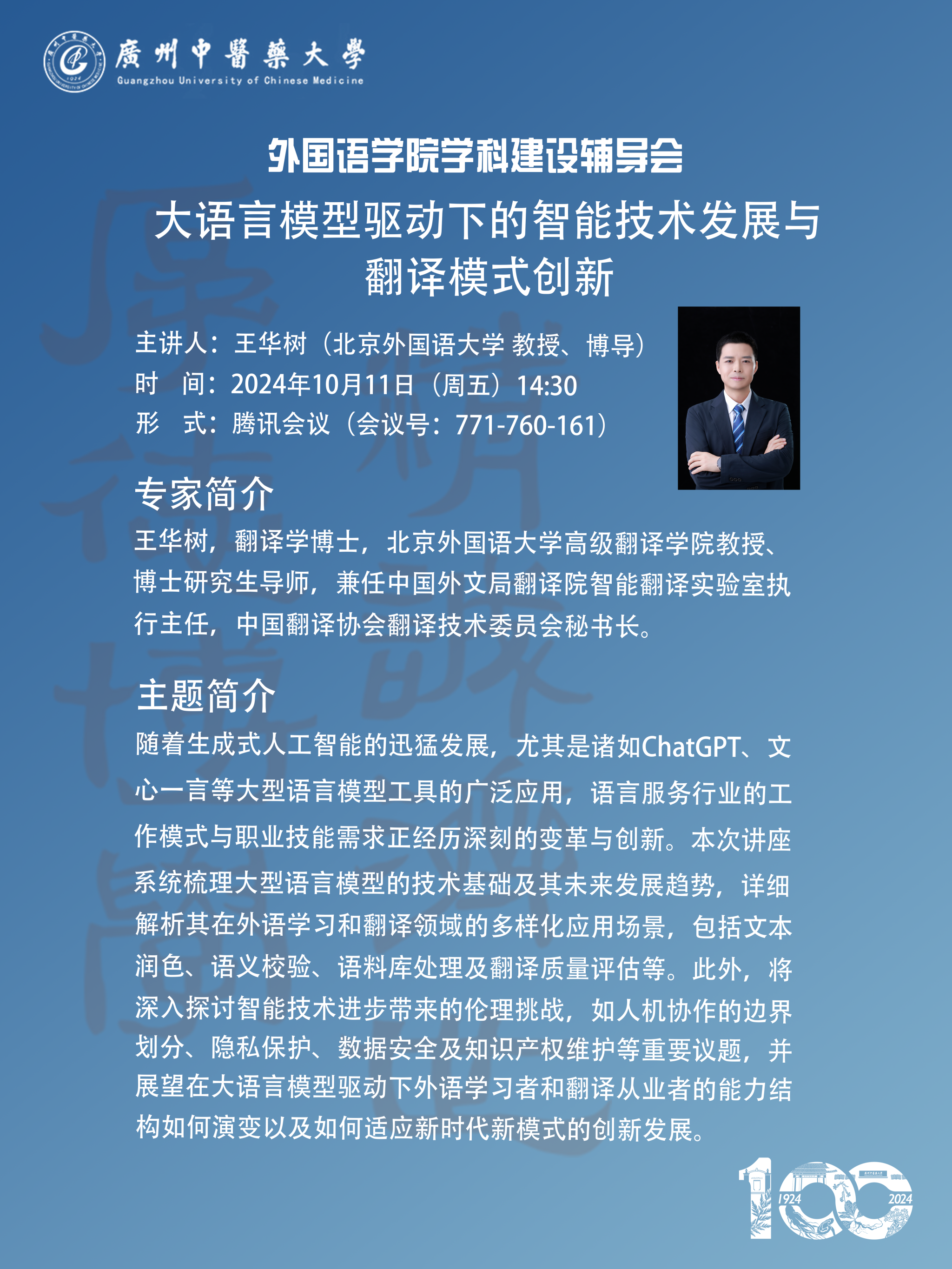 现定于10月11日明天周五下午2:30在腾讯会议召开英国上市公司365团队建设辅导会,会议邀请北京外国语大学王华树教授为大家作题为:大语言模型驱动下的智能技术发展与翻译模式创新辅导会,欢迎全院教师参会。